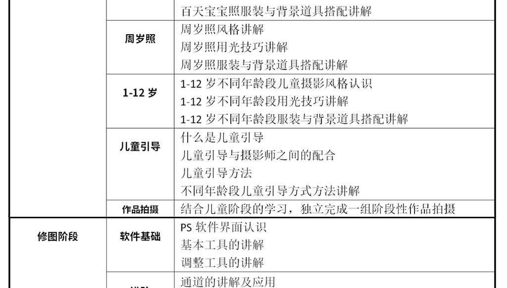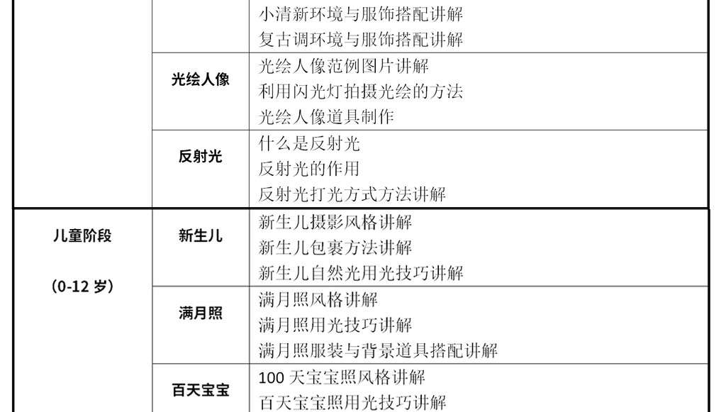 本课程分为基础阶段、灯光阶段1、儿童阶段(0-12岁)、修图阶段等课程