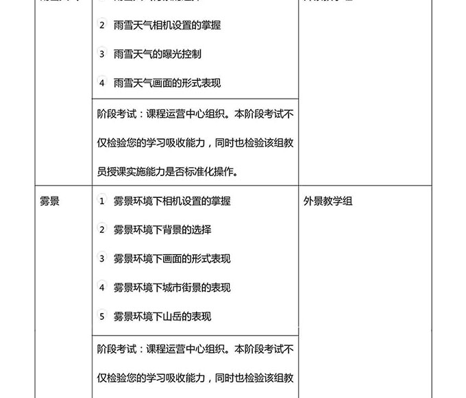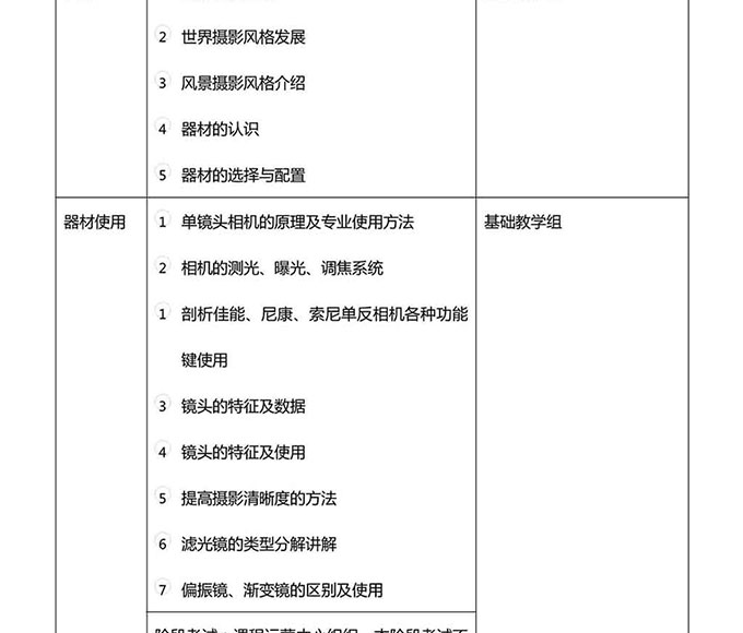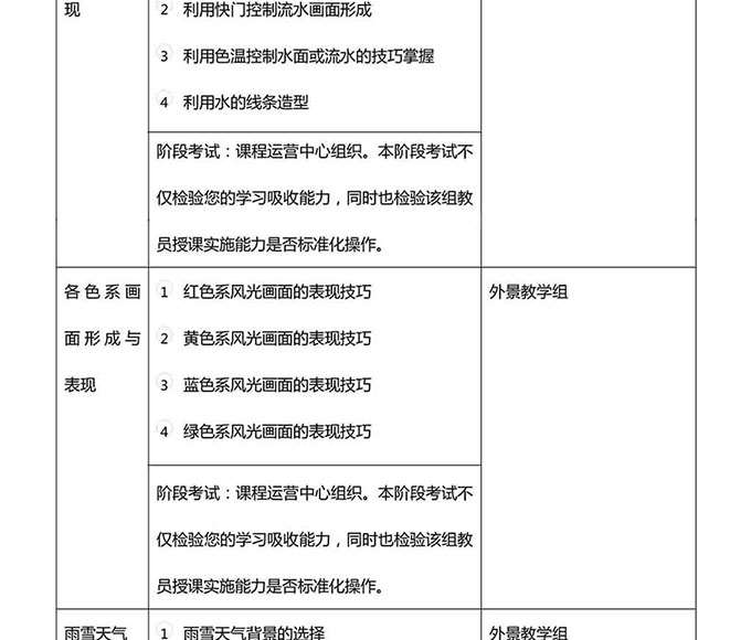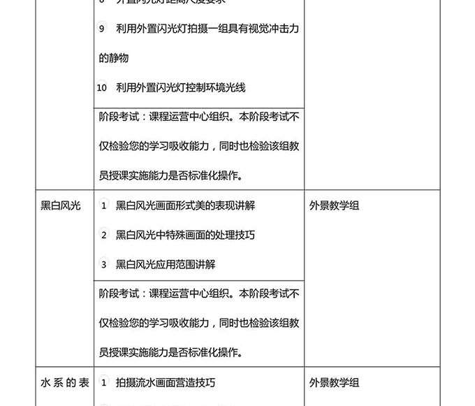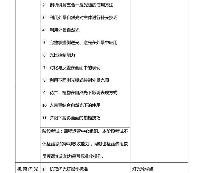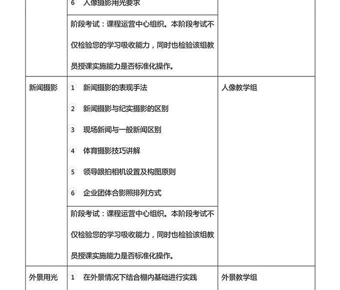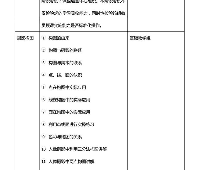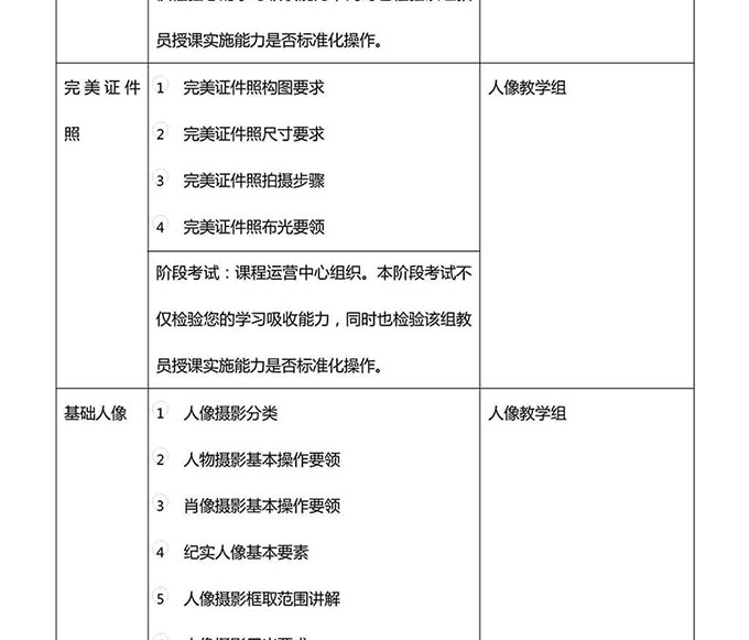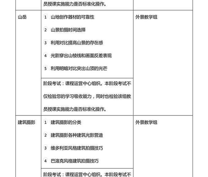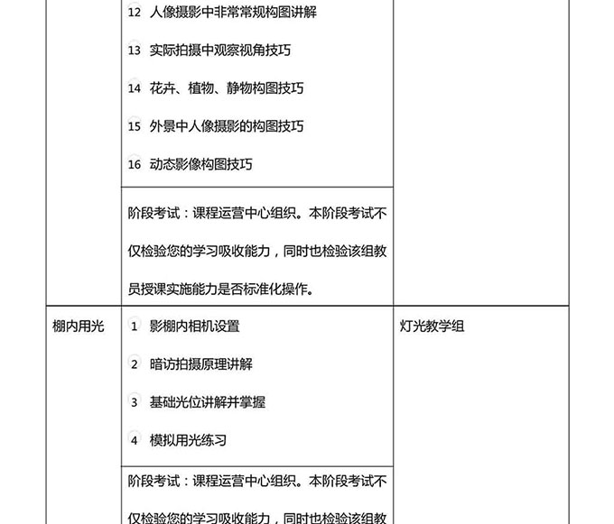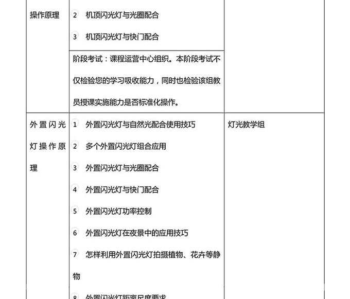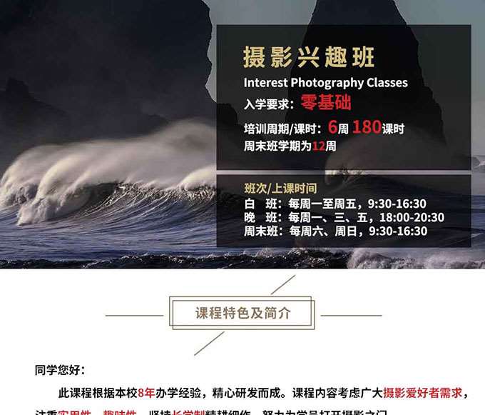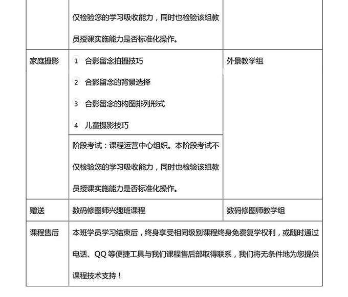 本课程包含入门、器材使用、摄影构图、棚内用光、完美证件照、基础人像、新闻摄影、外景用光、机顶闪光操作原理、外置 闪光灯操作原理、黑白风光、水系的表现、各色系画面形成与表现、雨雪天气、雾景、山岳、建筑摄影、家庭摄影、、课程售后等 课程。